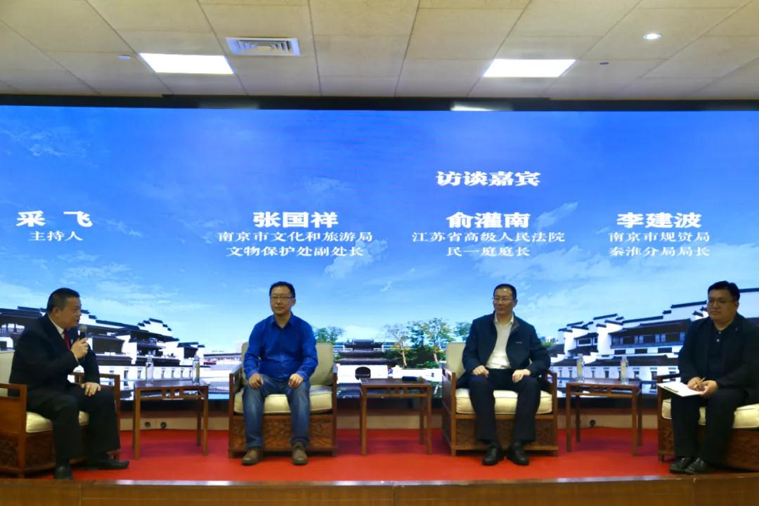 仪式开始,首选举办了古民居司法保护论坛。论坛邀请了江苏省高级人民法院民一庭庭长俞灌南、南京市文化和旅游局文物保护处副处长张国祥、南京市规资局秦淮分局局长李建波三位嘉宾。三位嘉宾分别从法院审判职能、文保单位保护修缮文物职能、规资单位城市规划管理职能出发对该问题进行了解答。