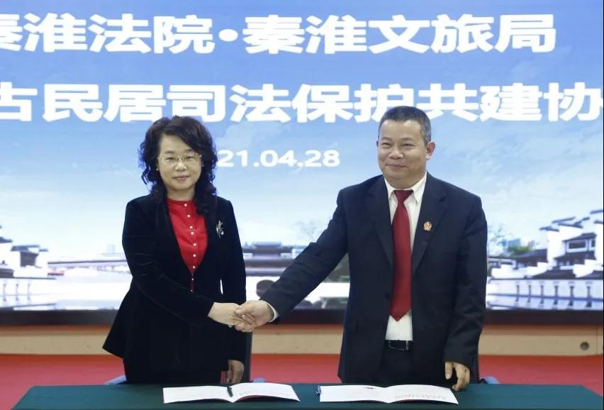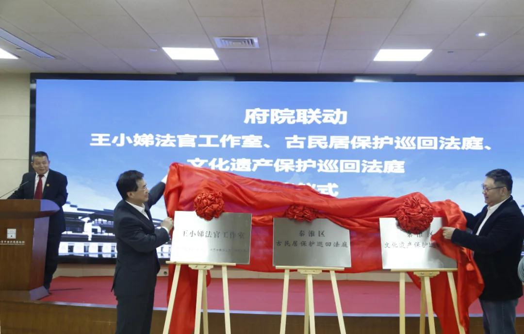 随后,秦淮法院副院长采飞与秦淮区文旅局局长姜勇美签署了共建协议,并由南京市中院副院长史俊与南京市文旅局副局长颜一平给“王小娣法官工作室”“古民居保护巡回法庭”“文化遗产保护巡回法庭”揭牌。