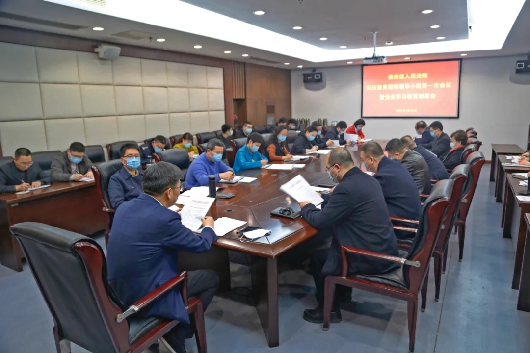 会议第一项议程,由院党组书记、院长周守忠为大家传达中央政法委关于开展政法队伍教育整顿的决策部署和省市法院相关文件内容,介绍《秦淮区人民法院队伍教育整顿实时方案》并介绍领导小组具体成员。
