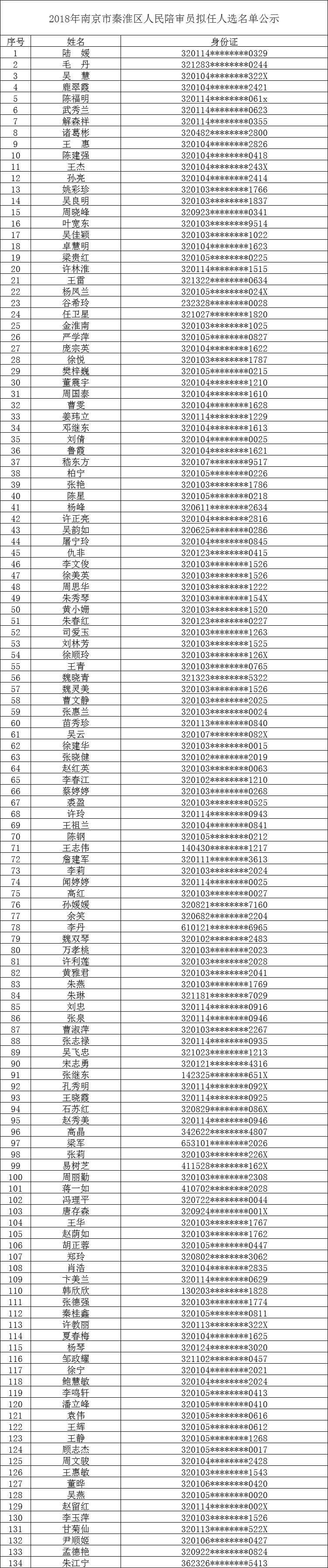 依照《人民陪审员法》《人民陪审员选任实施办法》,按照《2018年南京市秦淮区人民陪审员选任工作实施方案》要求,经第一次随机抽选、资格审查、第二次随机抽选,以下134名候选人确定为人民陪审员拟任人选,现予以公示。