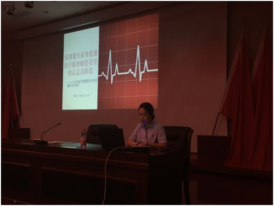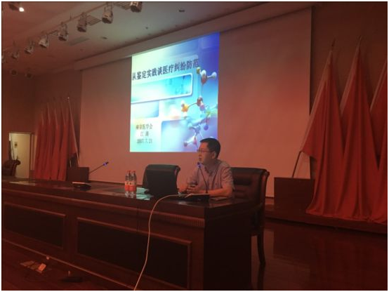本次会议的主题目为《医疗鉴定及审判实务视角下医疗纠纷的防范与规制》。市医学会江涛主任报告的题目为《从鉴定实践谈医疗纠纷防范》。报告揭示了医疗鉴定的现状及趋势,在对相关概念进行比较分析的基础上剖析了医疗鉴定中反应的主要问题,最后有针对性地向参加讲座的医护人员讲解如何应对医疗鉴定。