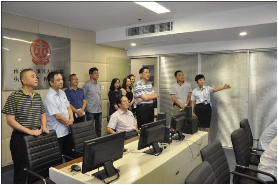 区人大常委会领导在秦淮法院党组书记、院长吴焱的陪同下,参观了秦淮法院阳光执行大厅、执行指挥中心,并观看了执行工作专题片《铁腕治赖》。
