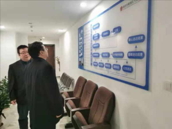 刘坤庭长分别至“24小时自助法院”、自助服务区、窗口立案区、非诉讼调解中心、诉讼材料流转中心、集约送达中心一一实地察看了诉讼服务中心各功能区,立案庭庭长陈策就各个区块功能划分、特色亮点及相关工作情况做了详细的介绍,在听取介绍过程中,刘坤庭长关切询问了自助诉讼服务区功能的具体操作流程及案件立案的衔接处理流程,并对审判辅助性事务的集约化管理运营给予了充分的肯定,对诉讼服务中心从便民利民出发设置导诉系统、诉状自动生成系统、网上自助立案一体机及24小时自助立案等智能化设备及便民服务的做法表示满意。