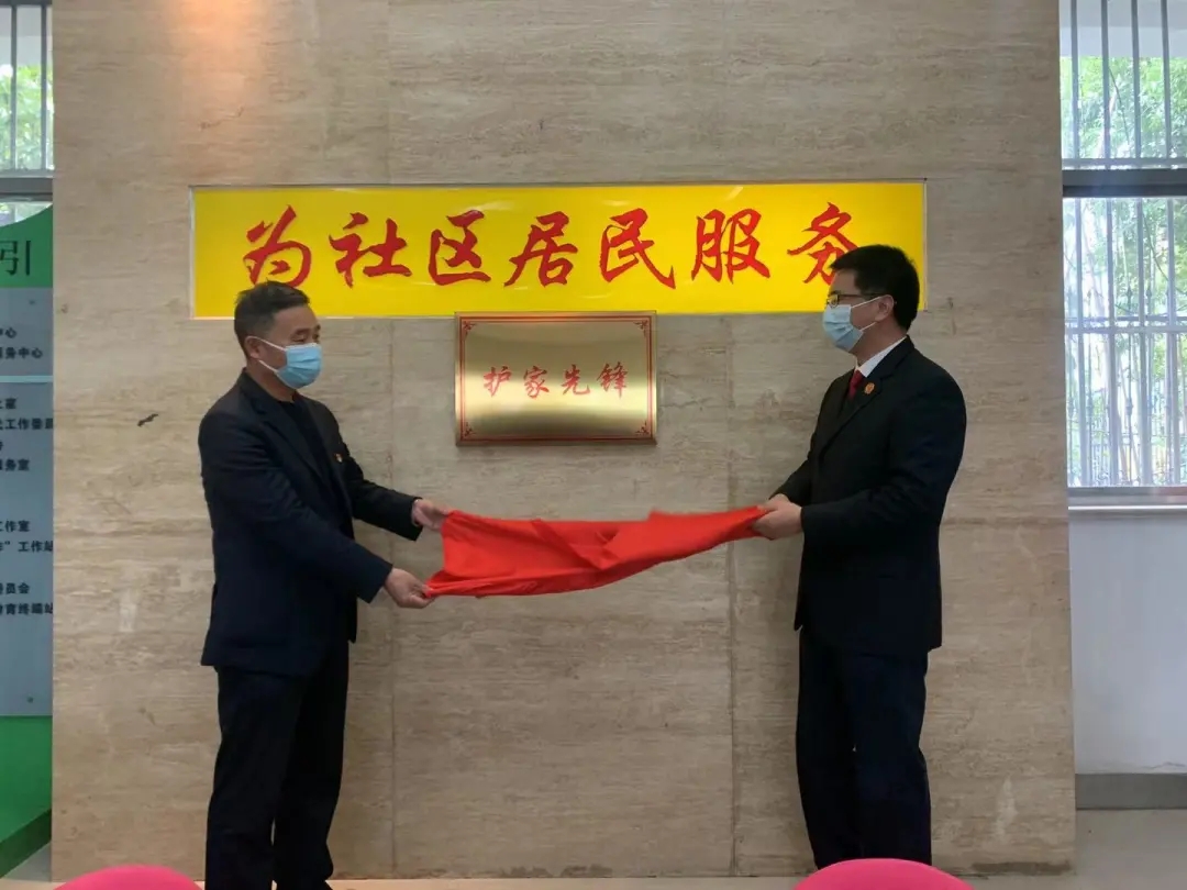 秦淮区法院党组副书记、副院长刘斌与秦淮区红花街道党工委委员、武装部长刘全利共同揭牌“护家先锋”。